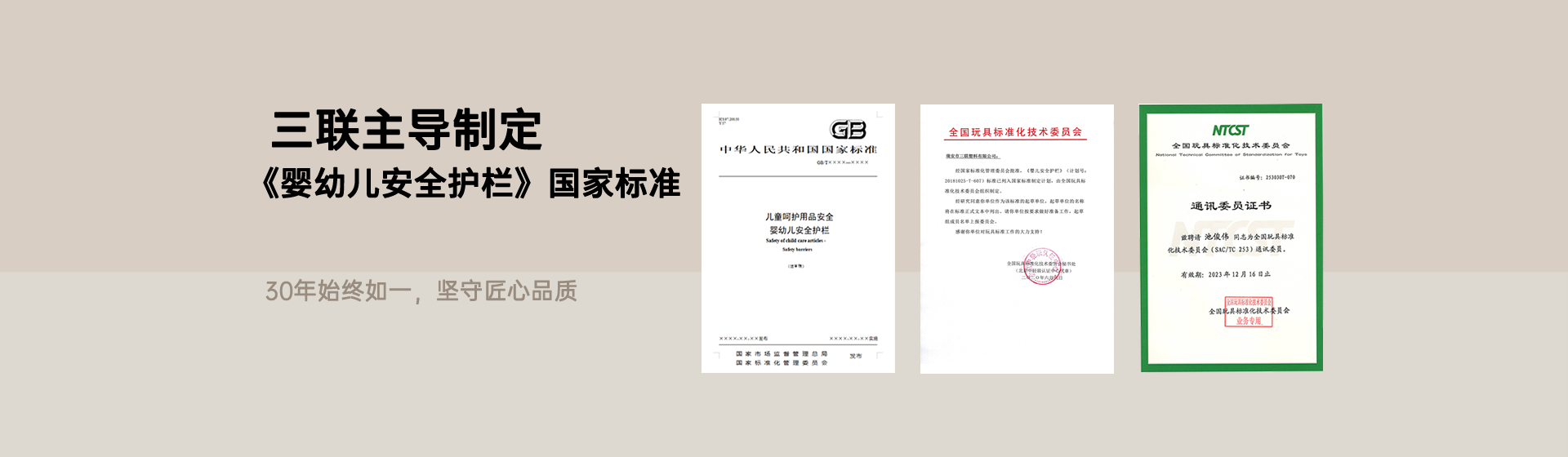 ? ? ? ? 近日,國家市場監督管理總局、國家標準化管理委員會發布中華人民共和國國家標準公告(2025 年第 24 號),由瑞安市三聯塑料有限公司作為第四起草單位、公司產品經理池俊偉擔任起草人的國家標準《兒童呵護用品安全 嬰幼兒安全護欄》(GB/T 46508-2025)正式獲批發布,并將于 2026 年 11 月 1 日起全面實施。這一標準的出臺,不僅填補了當前嬰幼兒圍欄類目缺乏統